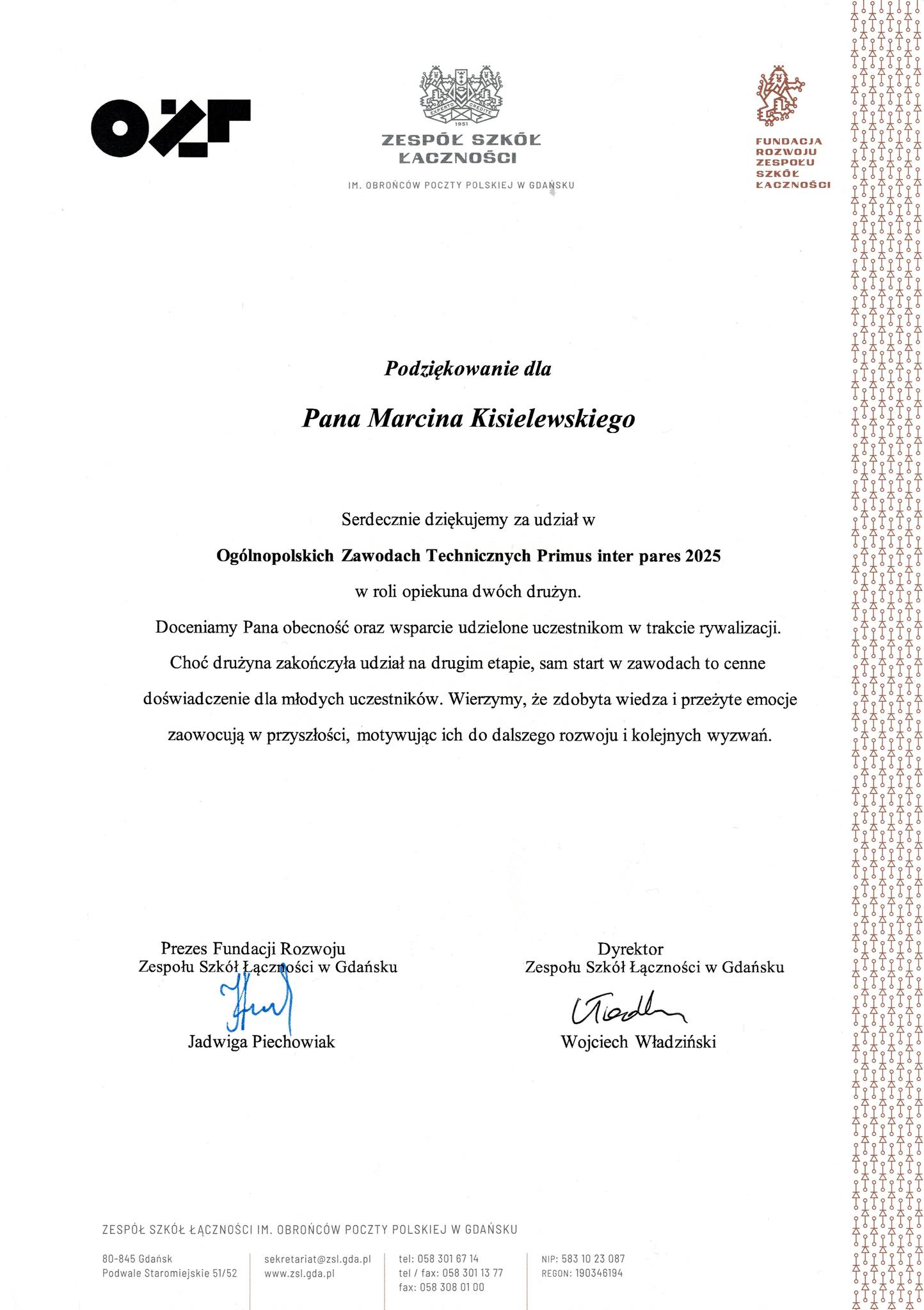 Z dumą informujemy, że uczniowie 4. klasy technik informatyk: Piotr Setnik, Wojciech Słomka oraz Jakub Jasiński zakwalifikowali się do drugiego etapu Ogólnopolskich Zawodów Technicznych Primus inter pares 2025. Pomimo, że do kolejnego etapu już nie awansowali, to i tak odnieśli spory sukces. Gratulujemy! Drużyną opiekował się Marcin Kisielewski - nauczyciel informatycznych przedmiotów zawodowych.