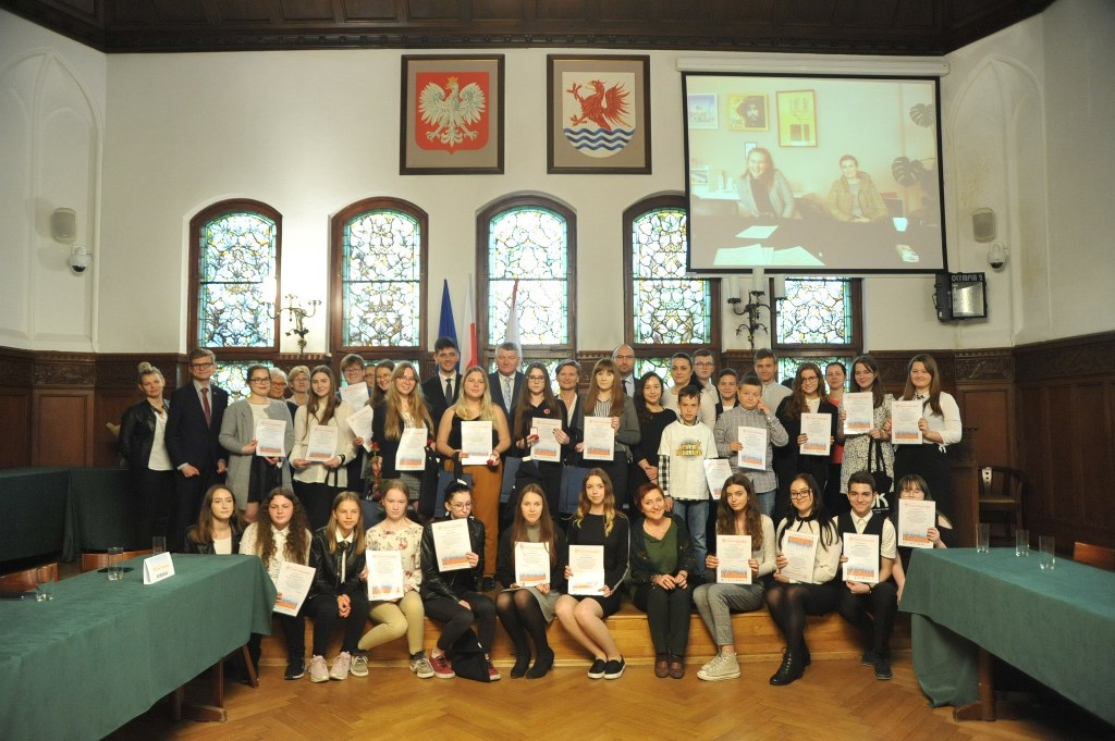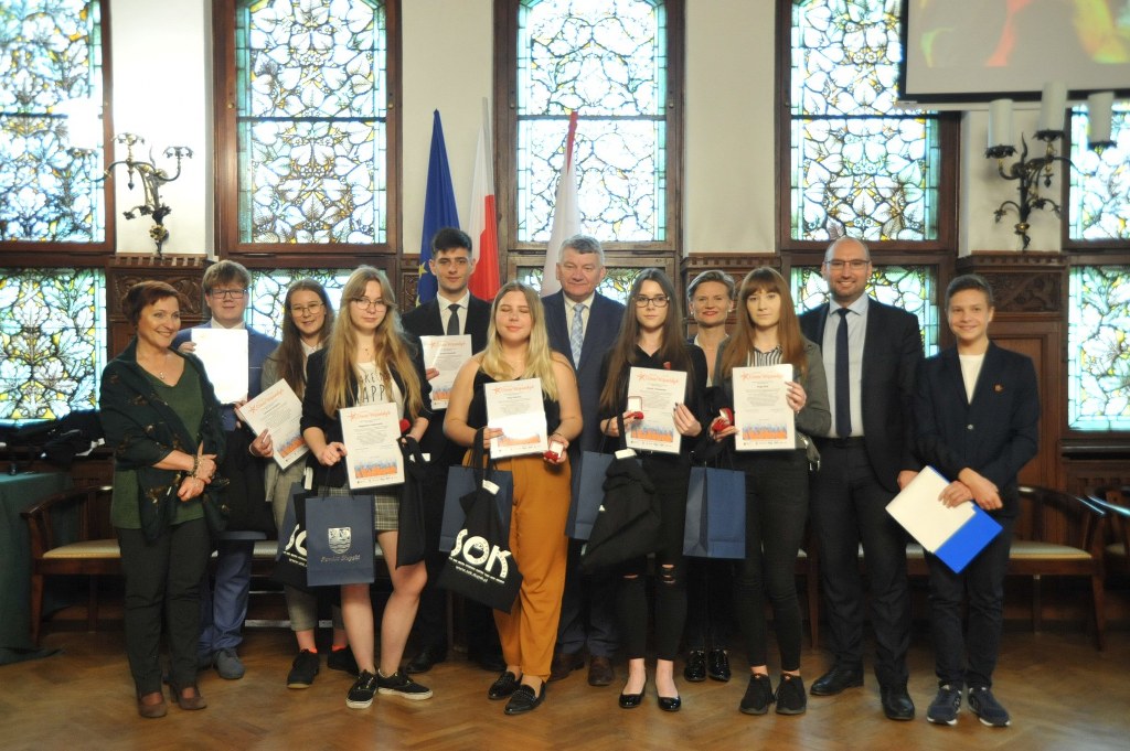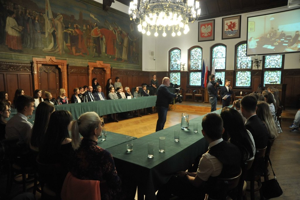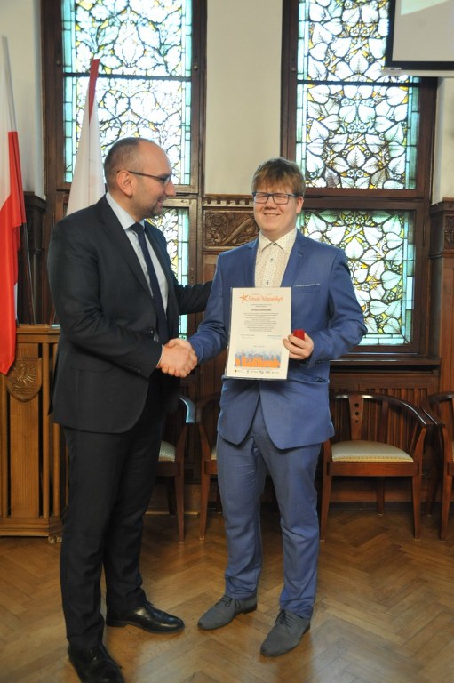 W słupskim ratuszu 20 maja br. odbyło się uroczyste spotkanie laureatów Jubileuszowej XXV edycji Ogólnopolskiego Konkursu Nastolatków 8 WSPANIAŁYCH. Jednym z laureatów został uczeń naszej szkoły Tomasz Jonatowski (uczeń klasy 4 technik informatyk). Zaproszeni goście i przedstawiciele władz samorządowych spotkali się w sali 211 Urzędu Miejskiego w Słupsku. Miasto Słupsk reprezentowała Pani Marta Makuch Zastępca Prezydenta Miasta Słupska, która opowiedziała o roli i znaczeniu zaangażowania młodych ludzi w działania społeczne, woluntarystyczne. Wyraziła uznanie dla laureatów za ich aktywną postawę i chęć niesienia pomocy.