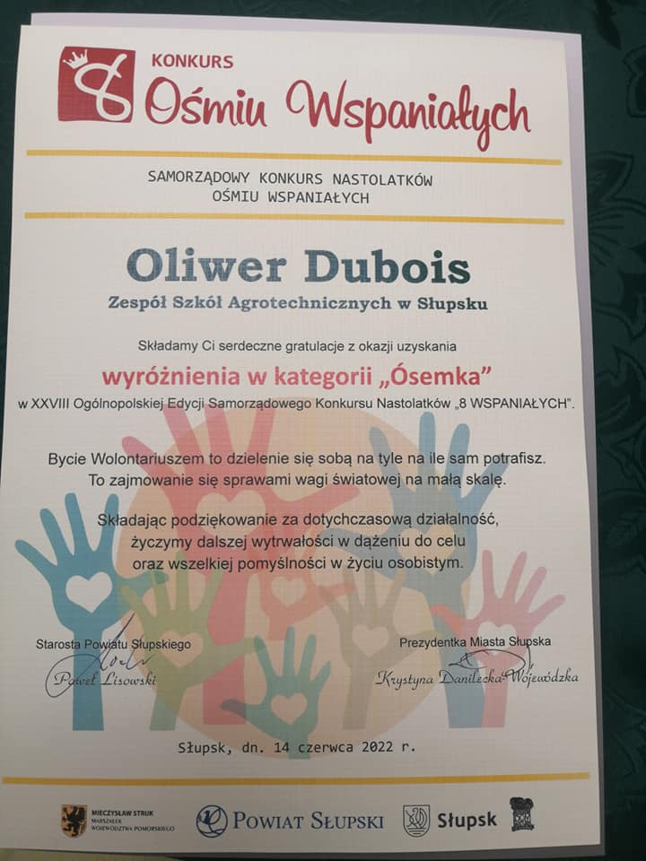Oliwer Dubois, uczeń klasy IV technik informatyk został laureatem XXVIII Edycji Ogólnopolskiego Samorządowego Konkursu Ośmiu Wspaniałych. Jest to prestiżowy konkurs, który ma na celu promowanie pozytywnych zachowań i działań oraz zachęcanie rówieśników do działań prospołecznych. Nagrody laureatom wręczali Prezydentka Miasta Słupska, Krystyna Danilecka-Wojewódzka i Starosta Powiatu Słupskiego, Paweł Lisowski. Gala konkursu odbyła się 22 czerwca w Młodzieżowym Domu Kultury w Słupsku. Ogromne gratulacje dla Oliwera!